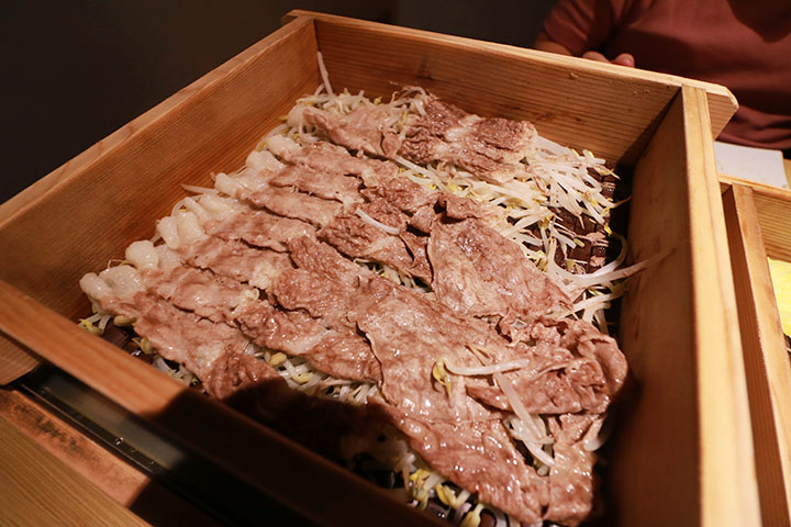 The set arrived and it came in this stacked wooden box. We were instructed to not open the lid and let it steam for ~12 minutes. After about 5 minutes, steam started emerging from the wooden box and it smelt incredible. Once 12 - 15 minutes were up, the waiter came back and it's time to dig in! The first box contained a variety of assorted vegetables, while the box on the top contained thinly sliced pork and beef.